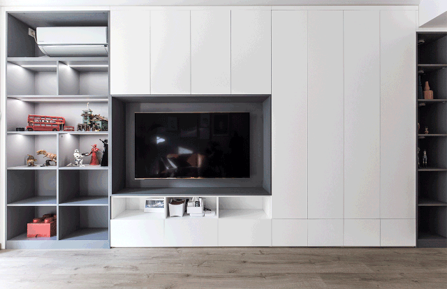 电视背景墙真的超级超级实用了,一整面墙的柜子开放和封闭式收纳结合,还加入灯光更显得有层次感。
