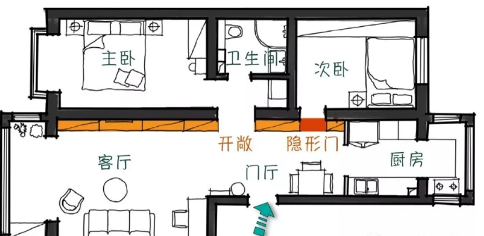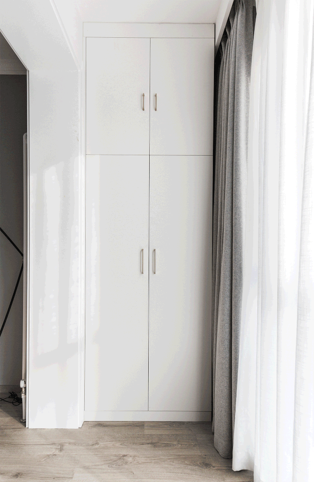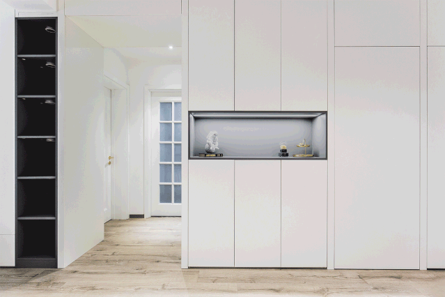 对面墙上做了置顶嵌入式鞋柜,中间留出空间摆放装饰品。柜门无把手设计,让整个空间看起来更整洁。鞋柜旁边的隐形门后面是次卧。