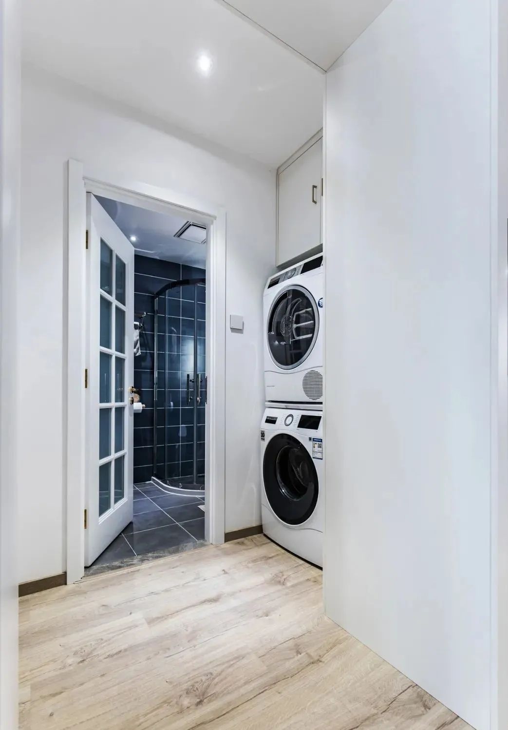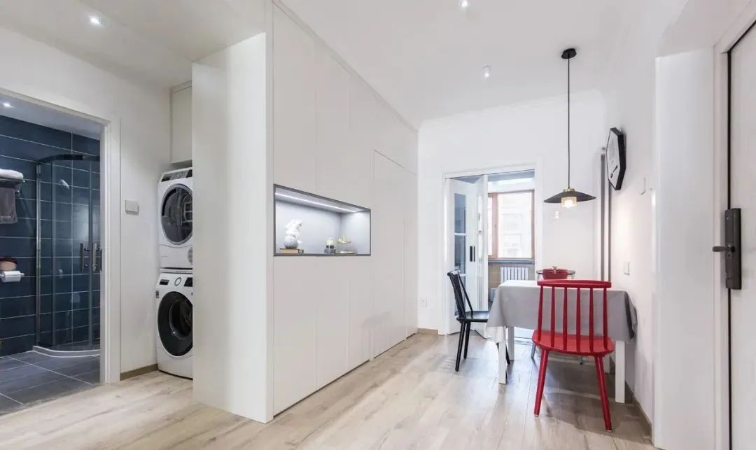 卫生间门外的角落里正好摆放上洗衣机和烘干机,顶部还做了吊柜收纳,充分利用好空间。