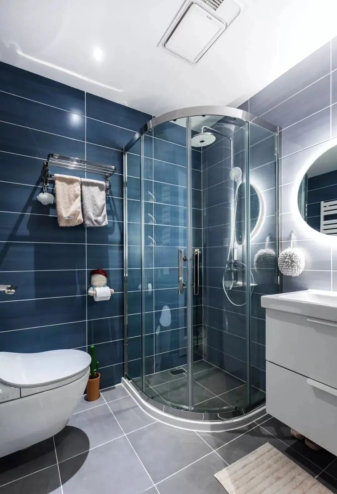 卫生间内部采用淋浴房做了干湿分离,马桶区和洗漱区分别布置两侧,圆形的镜子周围的灯光设计,给这个暗卫增添不少温馨舒适感。