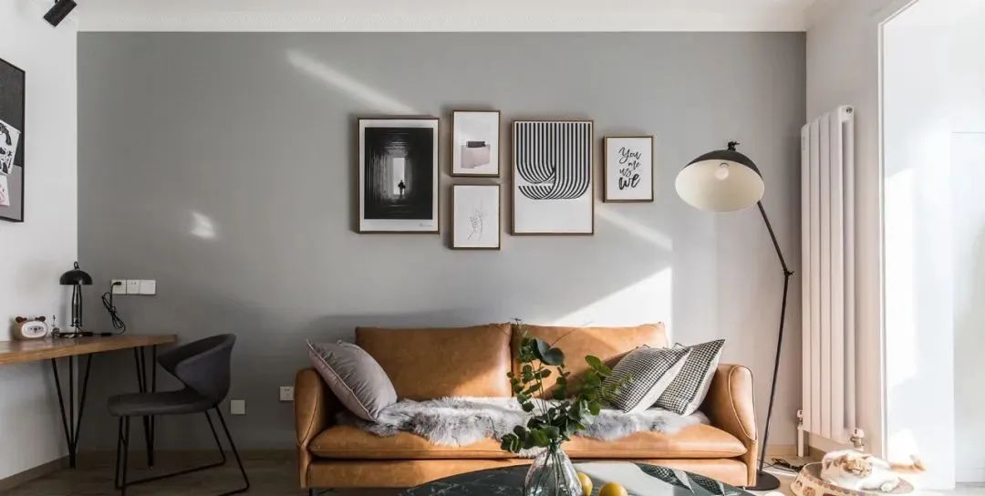 客厅,沙发背景墙刷灰色乳胶漆,挂上组合挂画装饰,黄棕色的皮质沙发一下子提升了客厅的质感,简约却不简单。