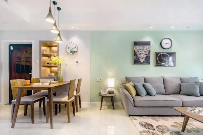 客餐一体化的户型,如果觉得设置玻璃、吧台等隔断占据空间,那么可以尝试用两种颜色做区域划分。