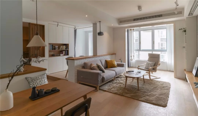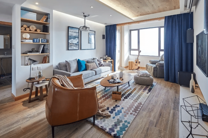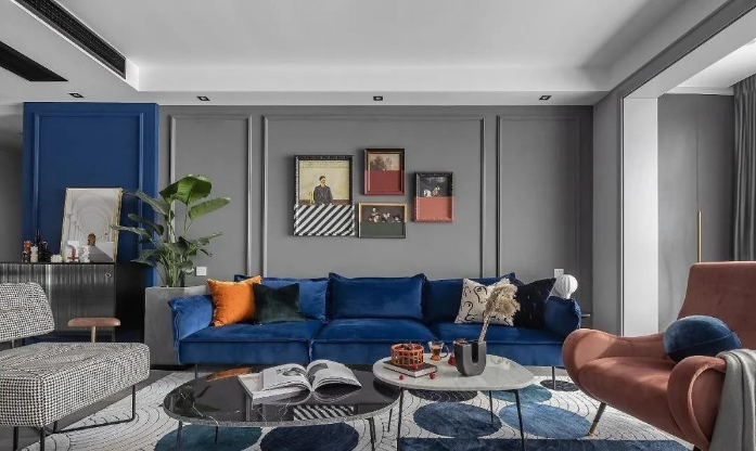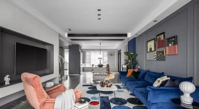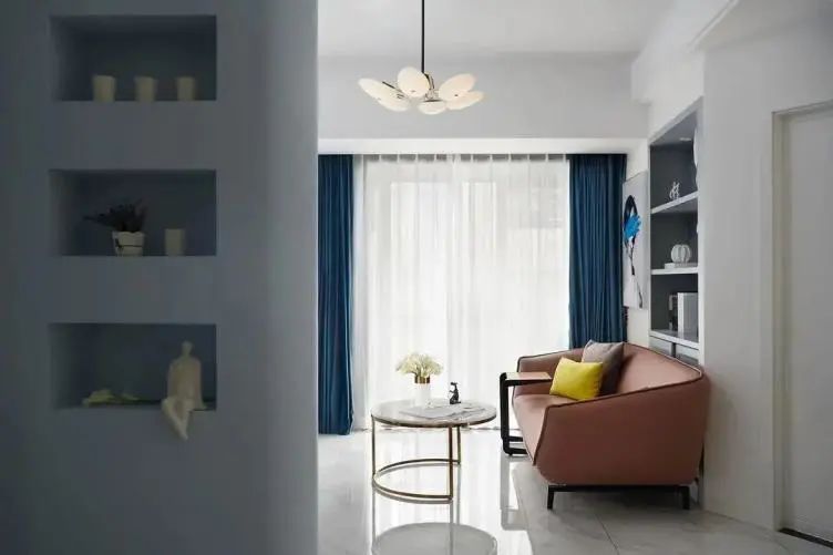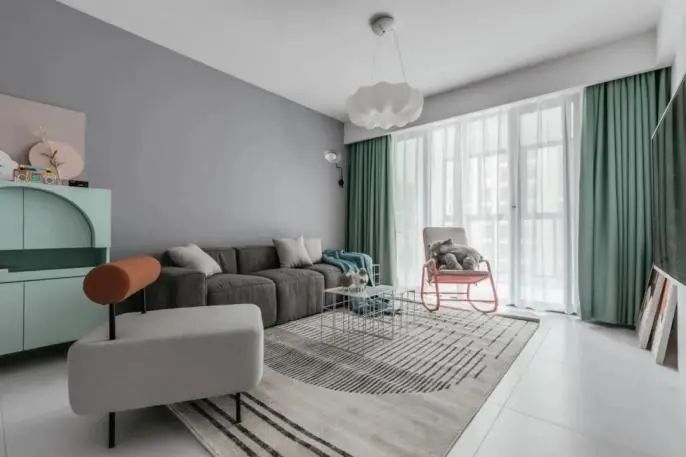 如果想要增加空间视野开阔感,蓝海建议选择饱和度较低的色系,比如高级灰、雾霾蓝等,与沙发、抱枕或者地毯等相互搭配,明亮开阔的客厅就出现啦!