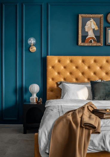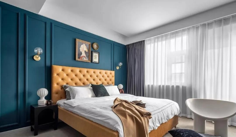 石膏线条还能运用在卧室中,与挂画组合,搭配太妃糖色高靠背床体让空间富有节奏感的同时不失复古感。