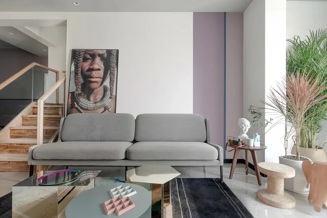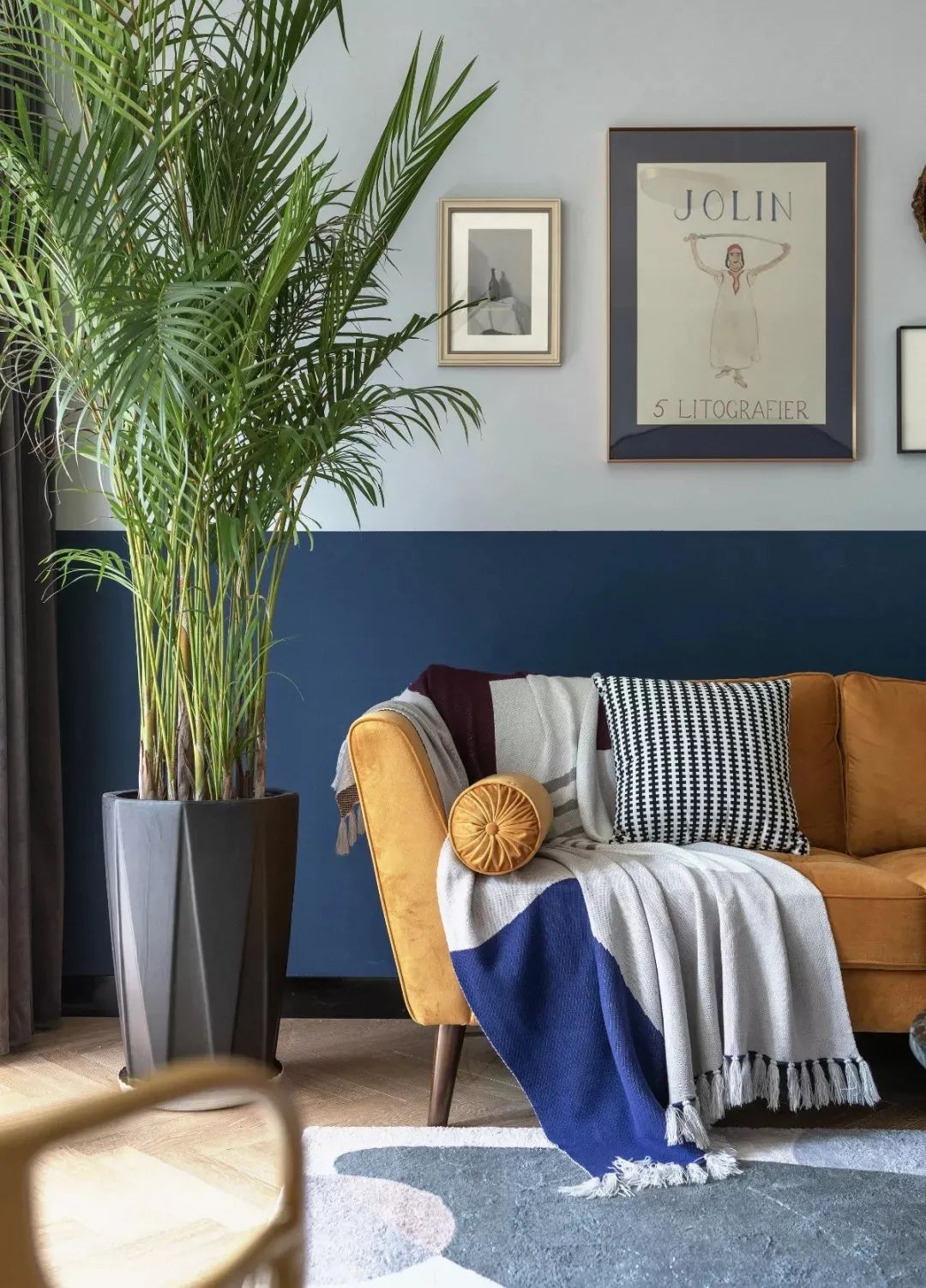 沙发背景墙设计还可以通过拼色让墙面更有层次感。横向拼接,一般上半部分颜色较浅,下半部分颜色较深,让客厅在视觉上扩展空间,整体更敞亮。