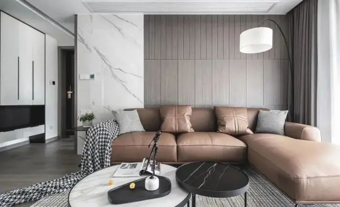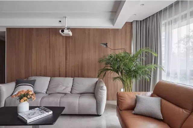 木饰面是现代家装设计中较常见的元素之一,木饰面以原木色为主,更薄更平,天然的纹理不需要其他过多的装饰,做沙发背景墙更加简约大气;而且木质感可以让空间更加温馨显档次。