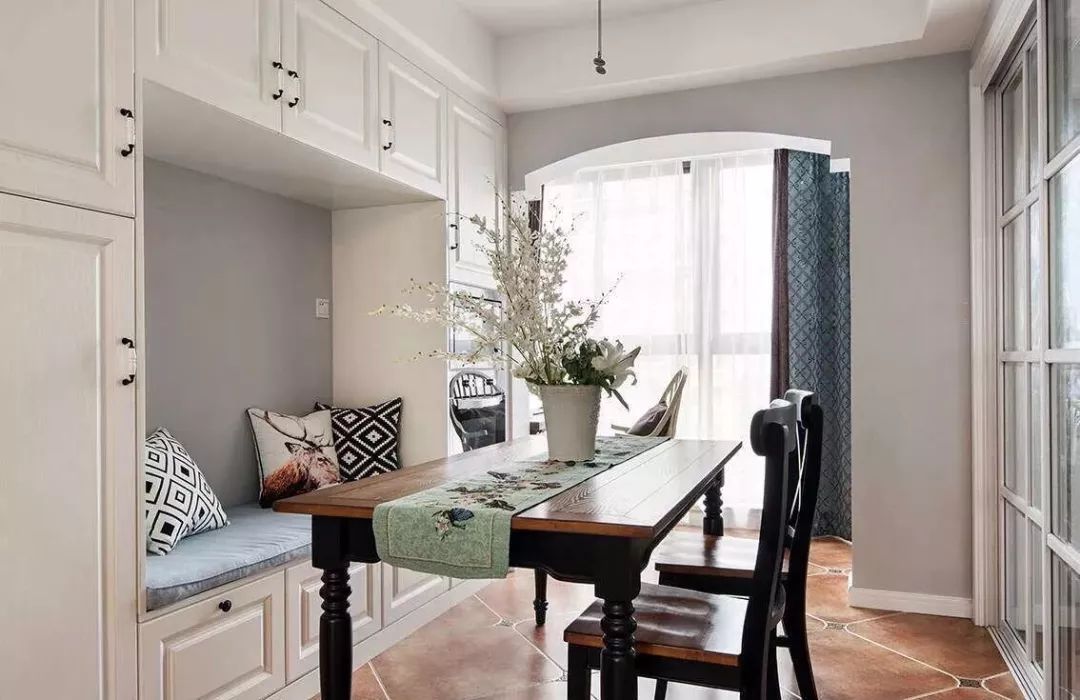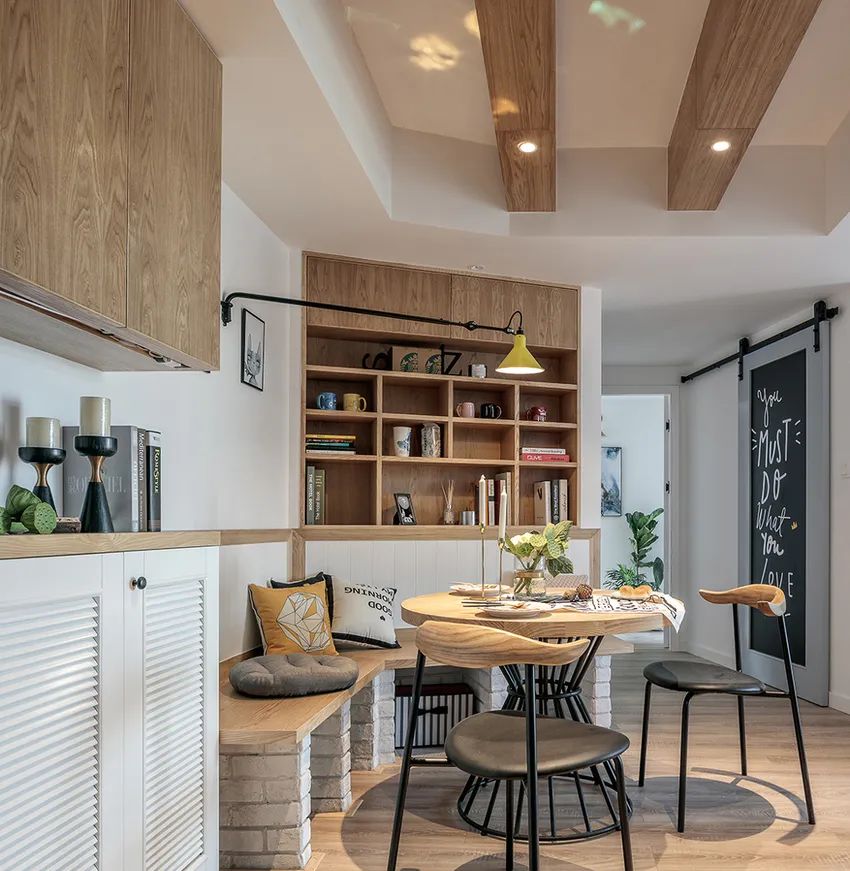 若是将卡座和餐边柜做成一体式,实用性会更强。一般呈现L形且卡座靠墙,这样不会阻挡进出的动线。