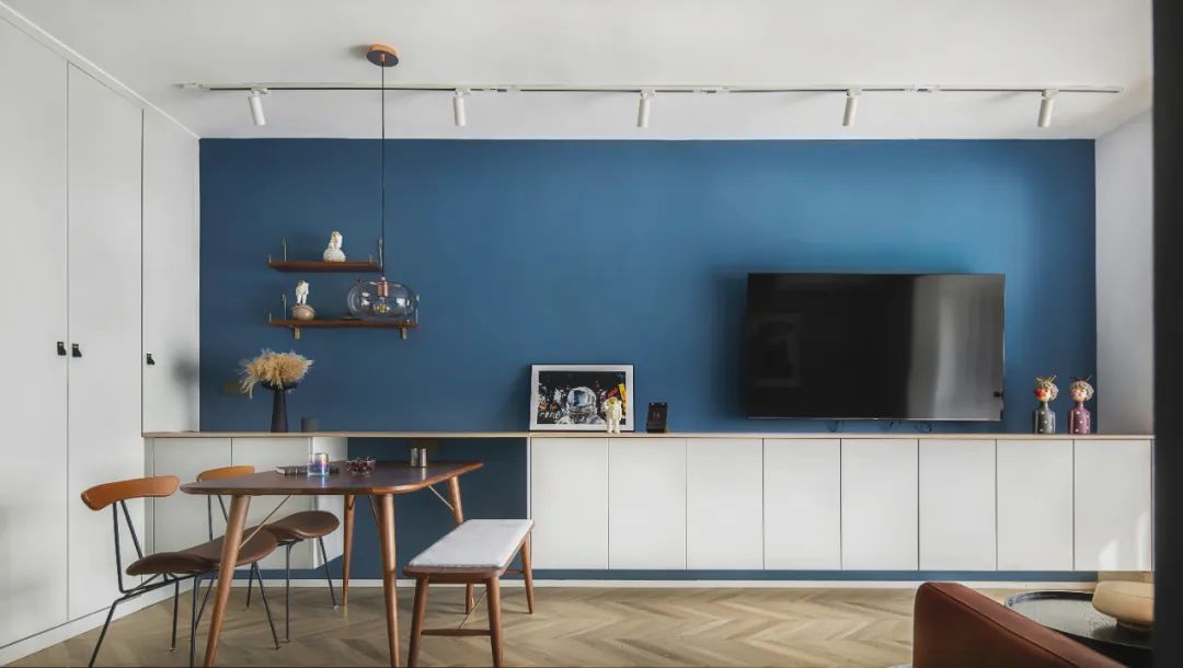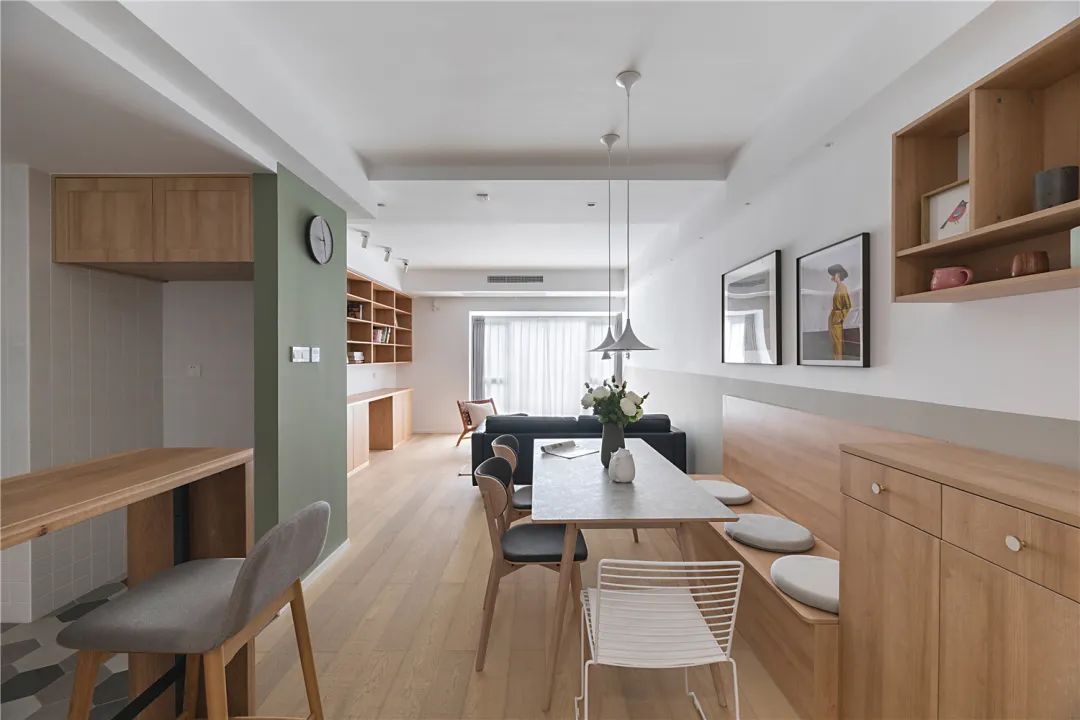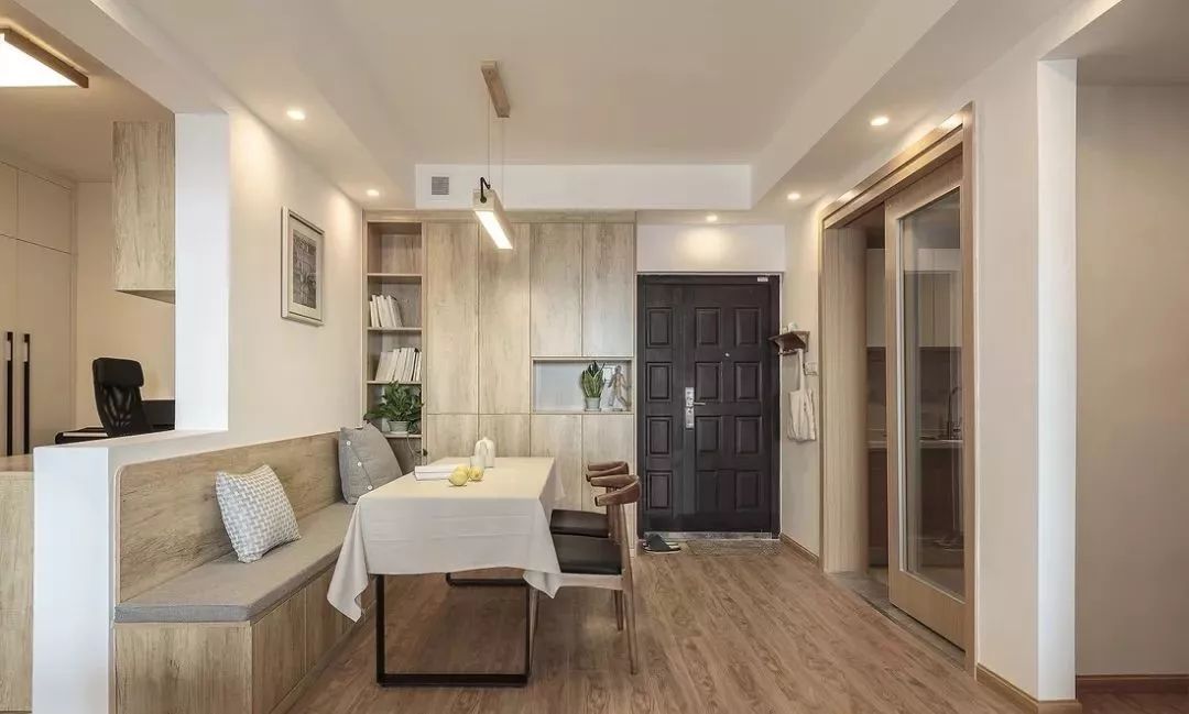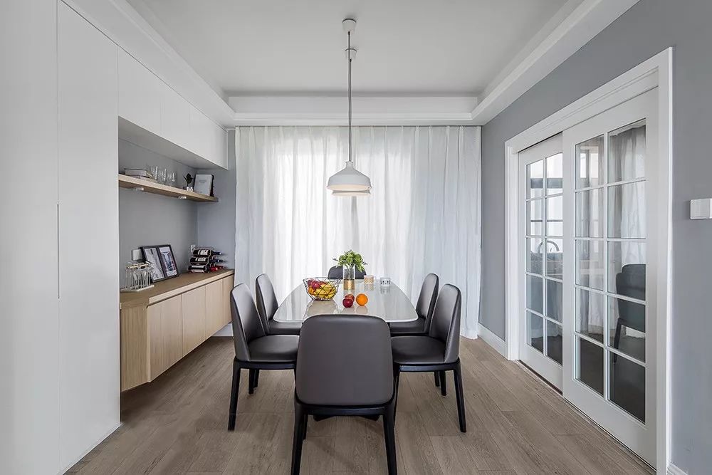 若餐厅背景墙不是承重墙,可以直接砸掉墙体,借用原本墙面的空间,将餐边柜做成入墙式柜体,减少占地面积。
