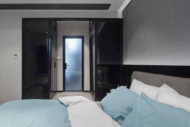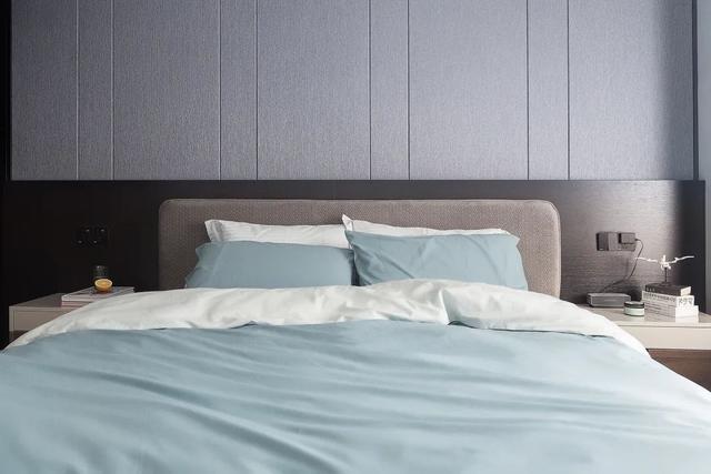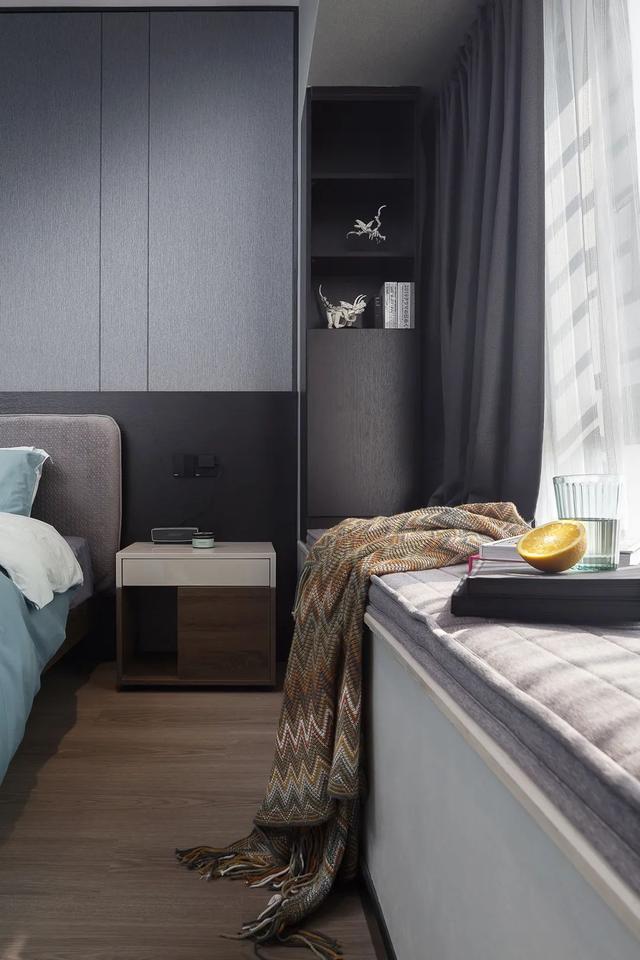 ▲卧室床头墙以黑色木饰面墙脚+灰色墙身硬包的设计,搭配上布艺靠背与木架床体,搭配淡蓝色的床单,呈现出一个简约舒适的卧室氛围感。