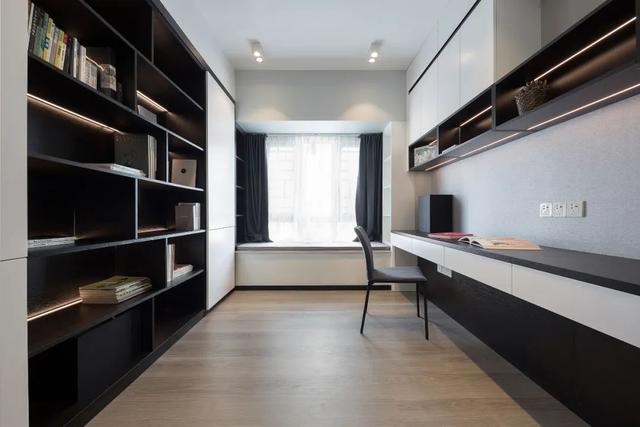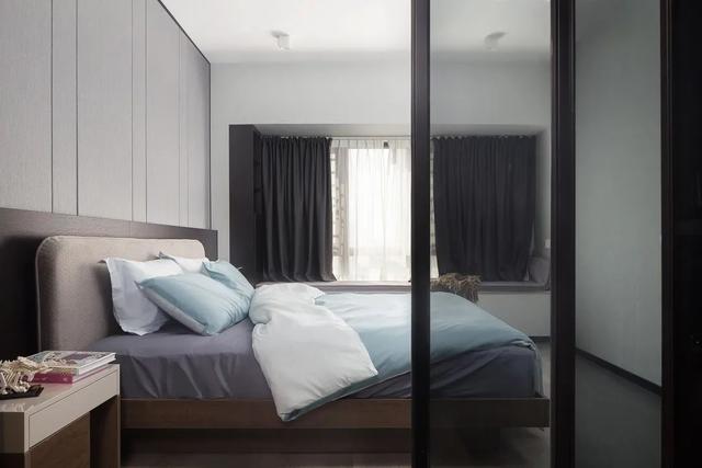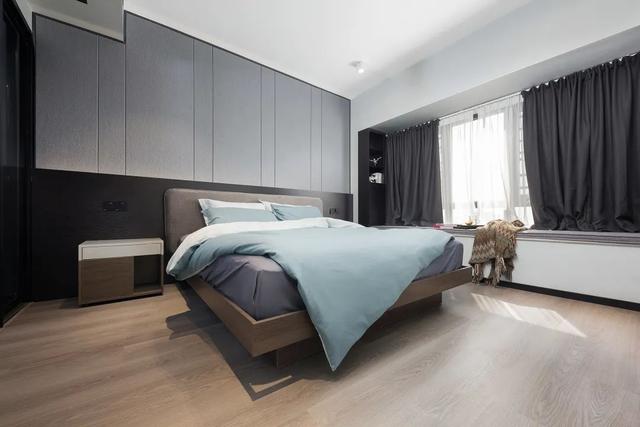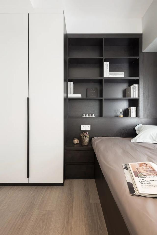 ▲次卧以黑色定制的榻榻米床+书柜组合设计,旁边还做了一个白色的衣柜,黑白配的定制柜体,加上灰色的床单与窗帘,带来一种现代简约的黑白灰空间感。