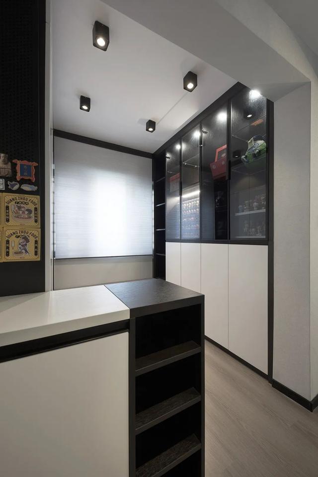 ▲靠窗定制卡座作为换鞋凳与休闲凳功能,右侧收纳柜上部分以玻璃柜门的设计,主人收藏的手办放置于此,一回家就看到了一个现代有趣的画面。