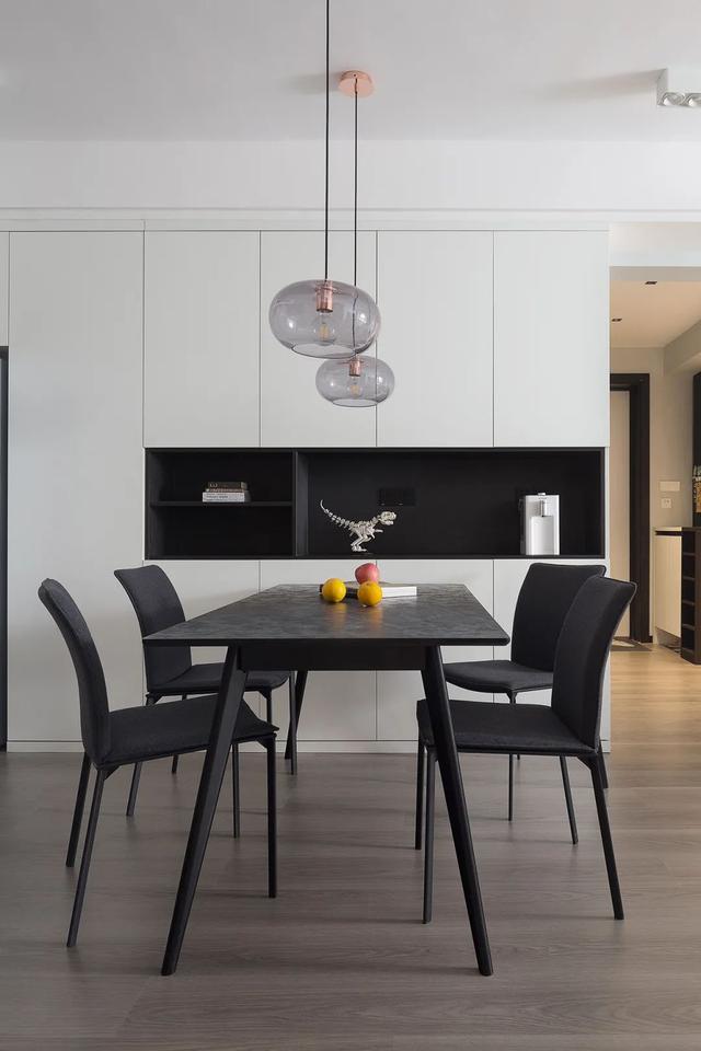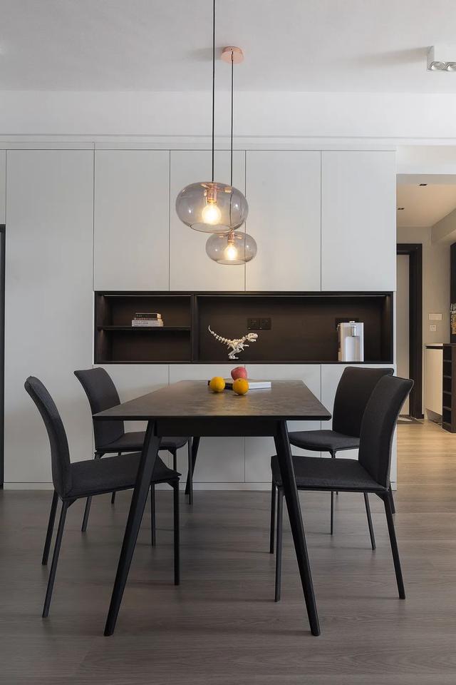 ▲餐厅侧边定制一个餐边柜,餐桌就挨着这个餐边柜布置,高级灰的餐桌椅与餐边柜的空格,布置在白色与木质感的空间下,带来一种现代舒适的优雅感。