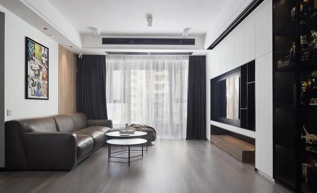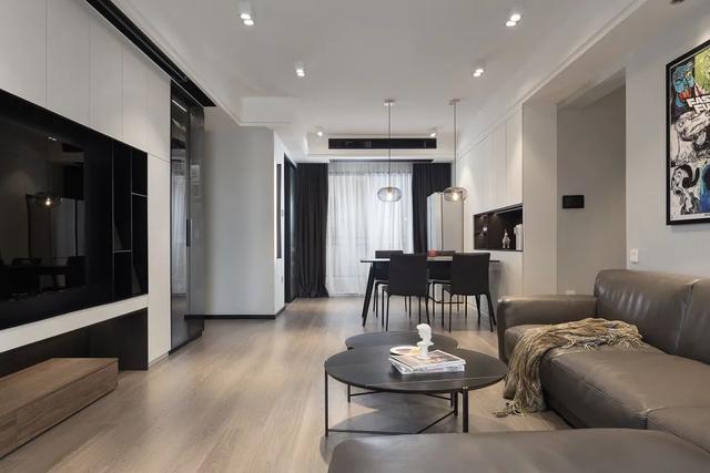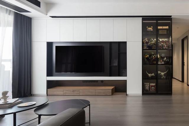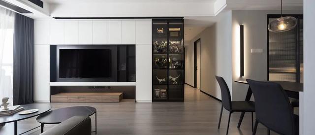 在125平米的空间内,整屋采取木地板的地面空间,并且在背景墙上适当加入木饰面,搭配净白的墙面与柜门,穿插上黑色的电器与柜格,让空间呈现出一种独特优雅的黑白灰氛围,为主人营造出一种简约优雅而舒适的生活环境。