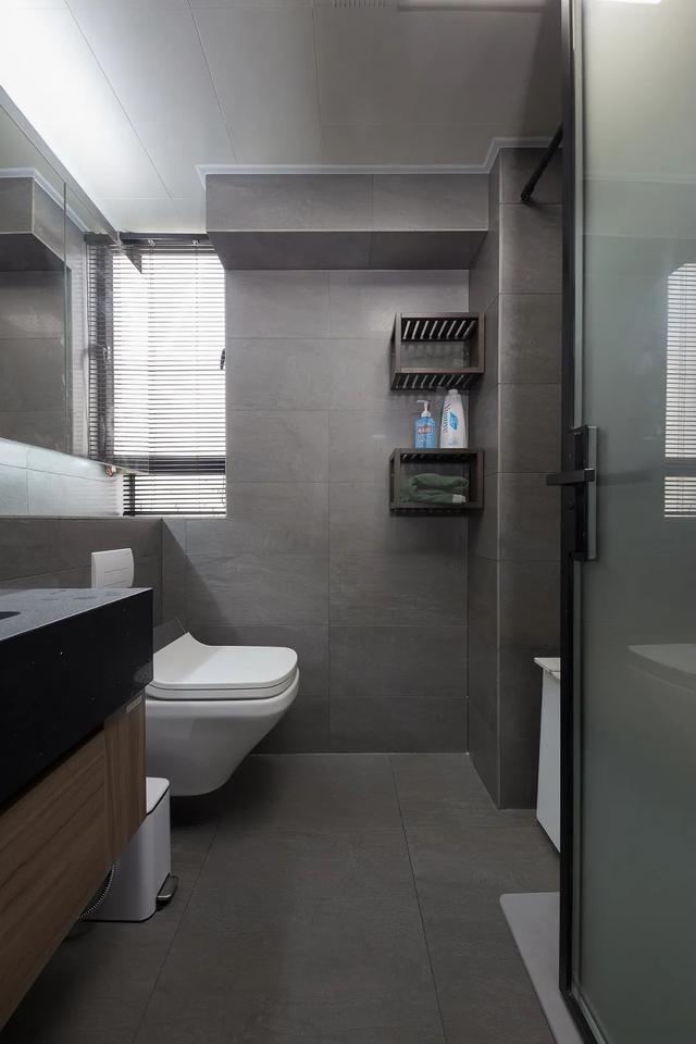 ▲主人卫生间整个空间也是以灰色为主,洗手盆后的镜柜延伸到马桶后,为主人提供了一个实用精致的卫浴空间,小窗户采取百叶帘设计,也让卫浴空间实用而有私密。