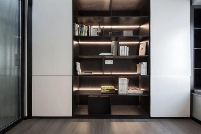 ▲书架以灵活的推拉门设计,在书架层板里还加入暗藏灯带,布置书籍、开启灯带,也让藏书空间充满优雅精致的现代感。