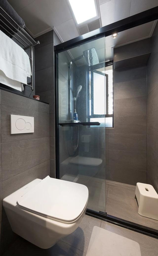 ▲壁挂马桶后方做了一个小墙台,并且在上边装了个毛巾架,整体灰色空间下,带给主人的是一种简约舒适的卫浴功能。
