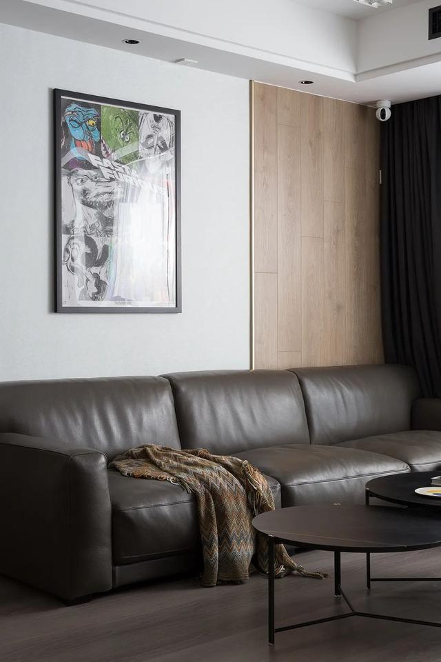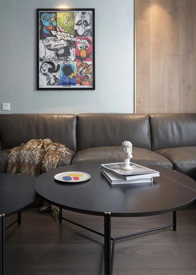 ▲暖灰色的皮沙发,后方木饰面质感+白墙的背景墙,挂一幅动漫主题图案的装饰画,也让空间更加俏皮有趣。