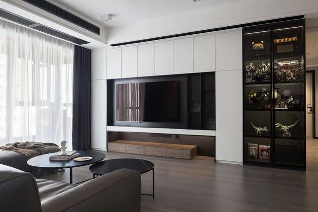 ▲电视墙右侧的展示柜以玻璃门设计,里面还加入的暗藏灯带,布置上手办,也让空间充满现代与活力有趣的氛围感。