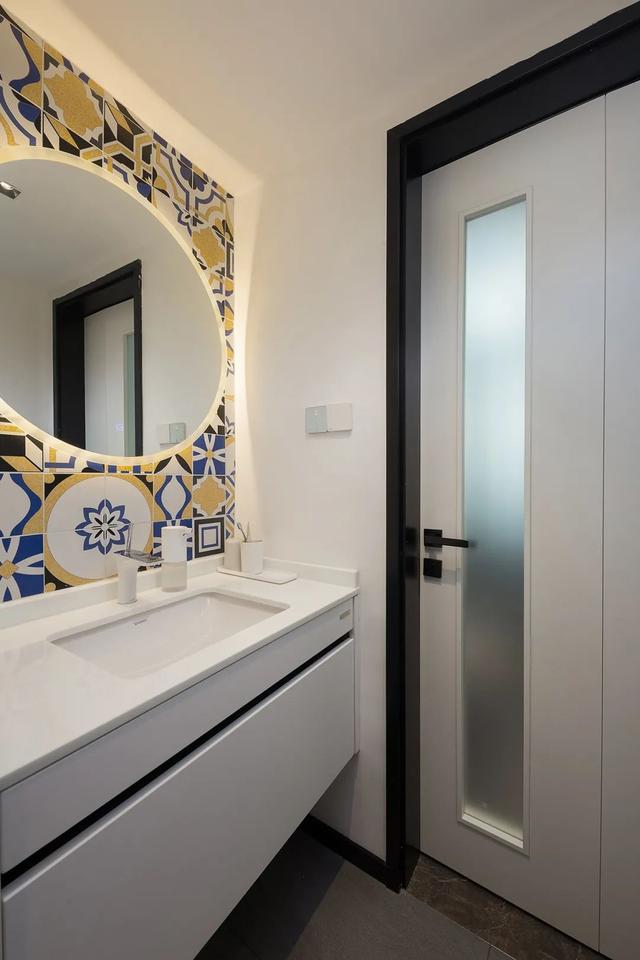 ▲次卫的洗手盆外置过道区域,白色的浴室柜柜体,墙面挂一面背光的圆镜,而在镜子后的墙面则是铺上花砖,带来一种文艺舒适的卫浴空间功能。