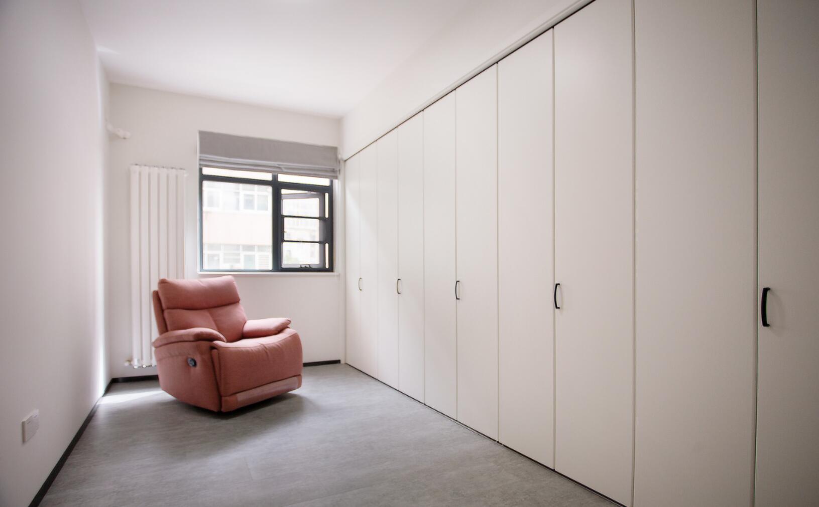 同时,放弃常规的定制衣柜,并采用折叠门加收纳系统的方式来处理,不仅可以起到节省成本的作用,还做到了开合自如。