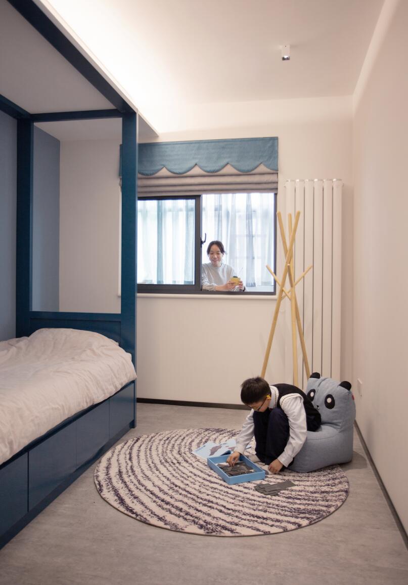 儿童房的布局同样很简单,定制的高低床体,不仅最大可以满足两个孩子的使用需求,还在这个单调的空间中,为孩子带来了极大的趣味性。同时,由于空间与主卧阳台相连,所以依然保持了空间的联动性。