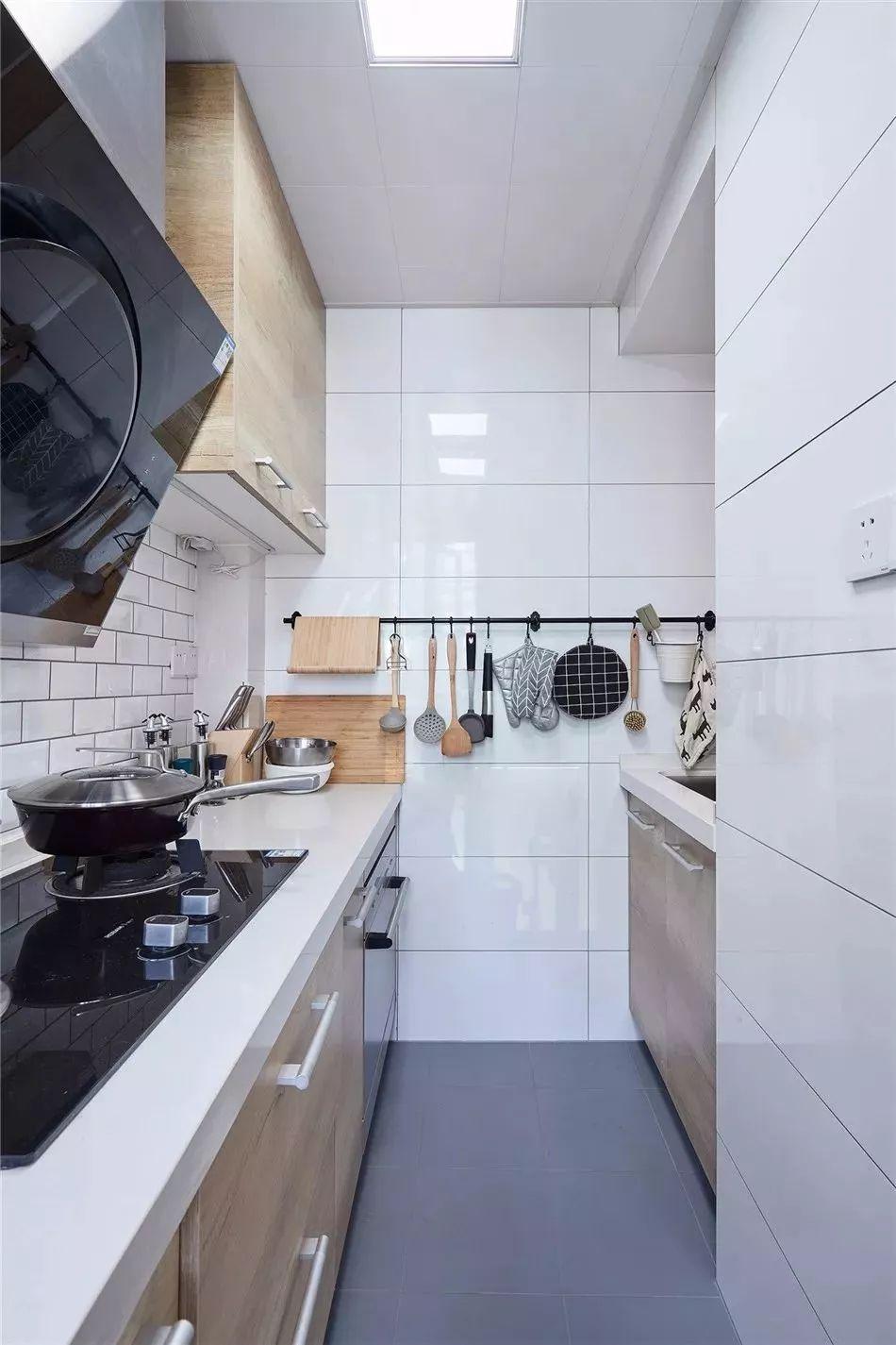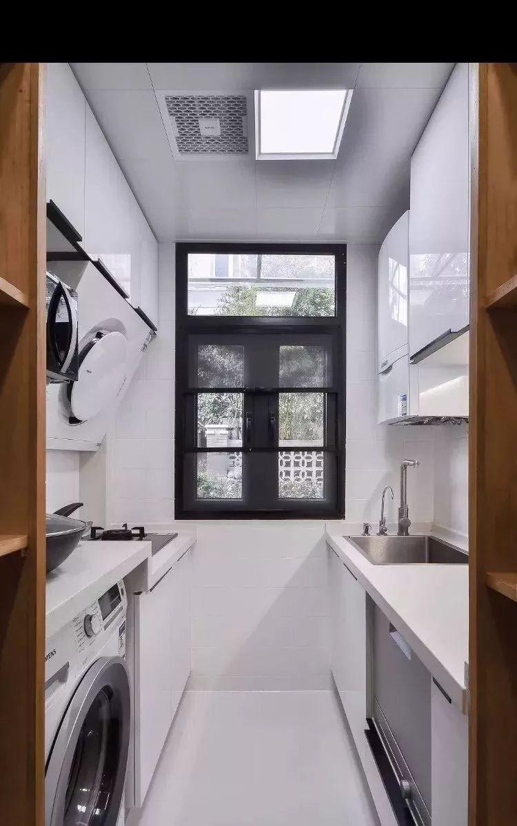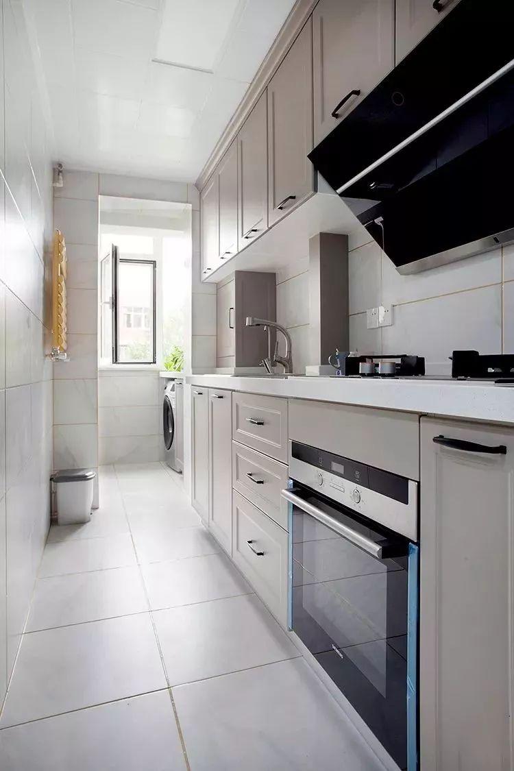 相比一字形厨房,二字形的厨房通常都较为宽敞方正,实用性较强;之所以不做成U形的,一般是因为长度不足或则挨着有生活阳台的门,无法做多一面的操作台,不过这样的厨房也是已经挺好用了。