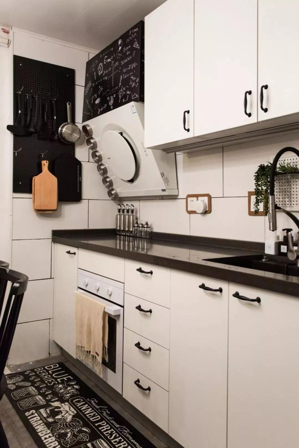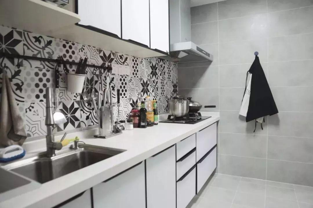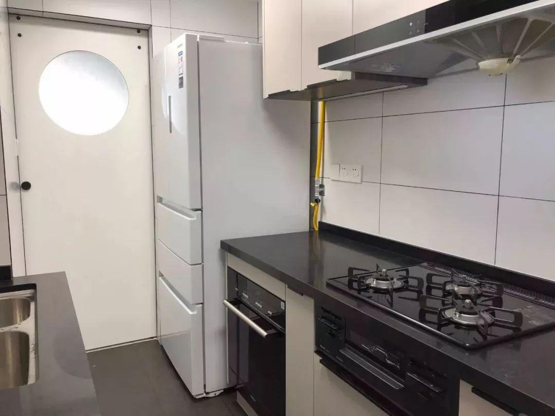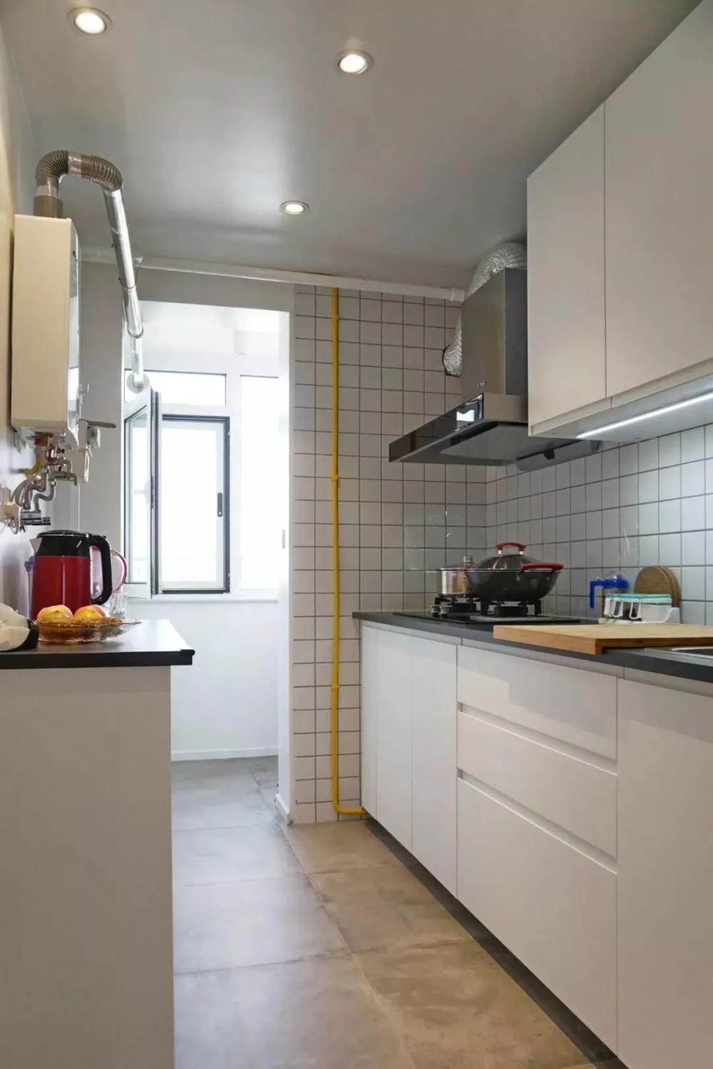 相比一字形厨房,二字形的厨房通常都较为宽敞方正,实用性较强;之所以不做成U形的,一般是因为长度不足或则挨着有生活阳台的门,无法做多一面的操作台,不过这样的厨房也是已经挺好用了。