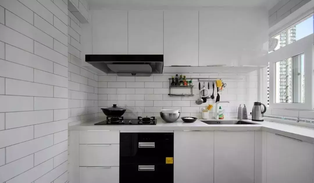 厨房装的是整体橱柜,白色的门板与黑色电器相搭配,简洁时尚。
