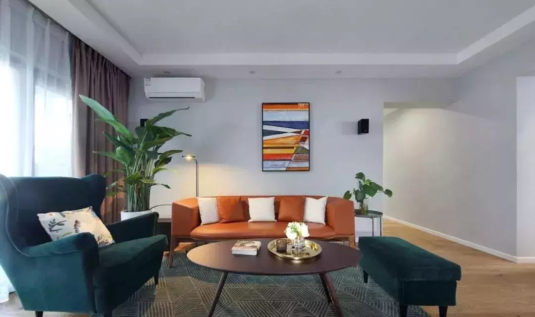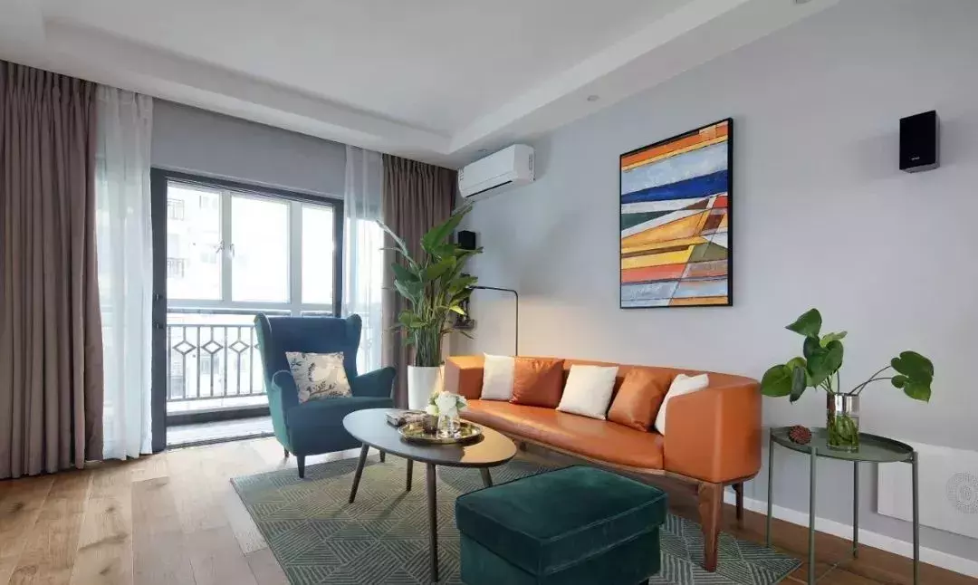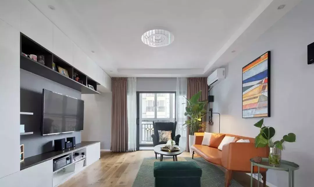 橙色的皮质沙发,彩色的墙面挂画,提升了整个客厅的活跃度,凸显时尚感,再摆上一些绿色植物装饰,让客厅显生机勃勃。