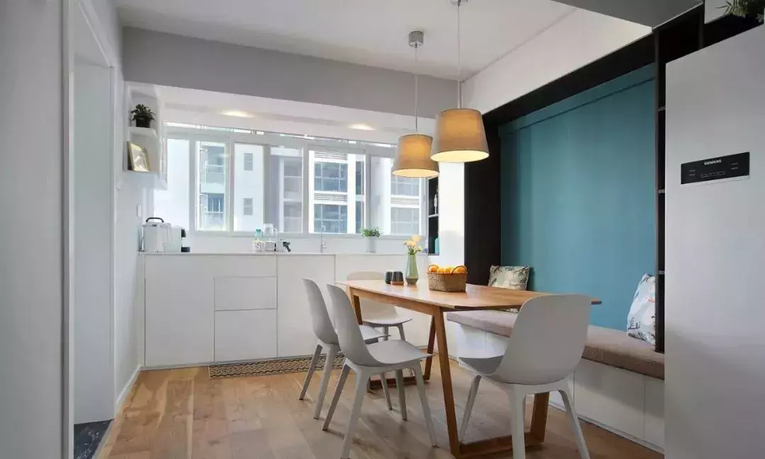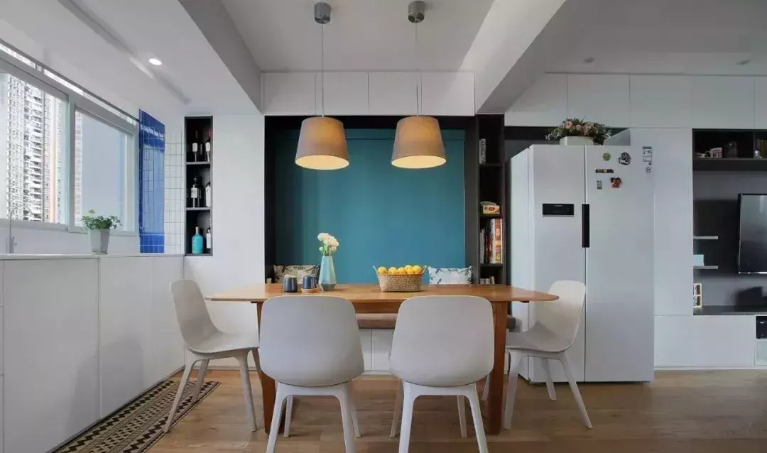 餐厅靠墙安装的是卡座,卡座比起椅子来更不占位置,同时还能增加储物空间,显得更加实用。