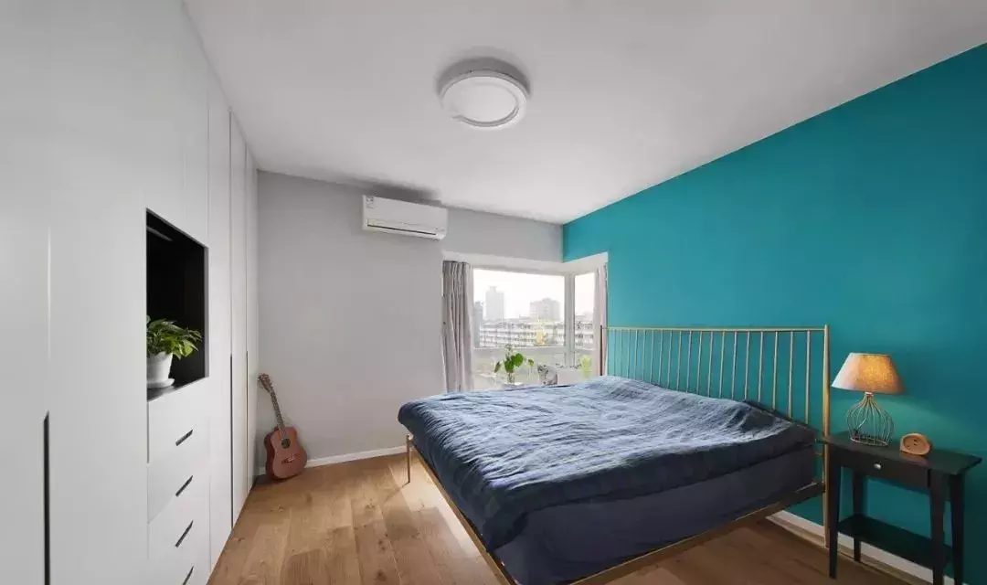 主卧摆放的是一张铜色铁艺床铺,搭配孔雀蓝色作为床头背景,质感满满,床尾安装了一排的衣柜兼储物柜,收纳空间很多。