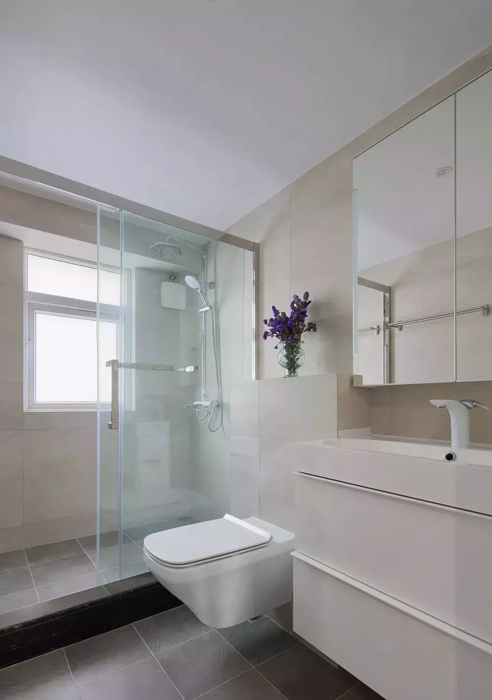 卫生间以白色和灰色相搭配,简洁明亮,白色的浴室柜带有收纳功能,方便存储洗漱物品,卫生间内装有淋浴房,干淡分离的设计让卫生间保持整体干燥。