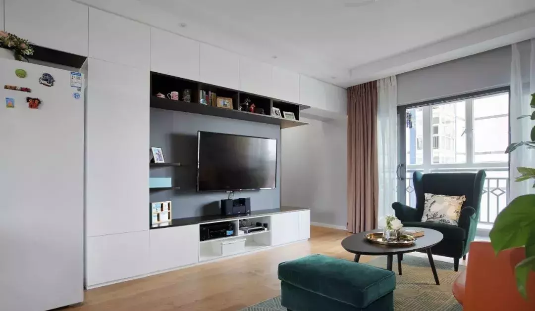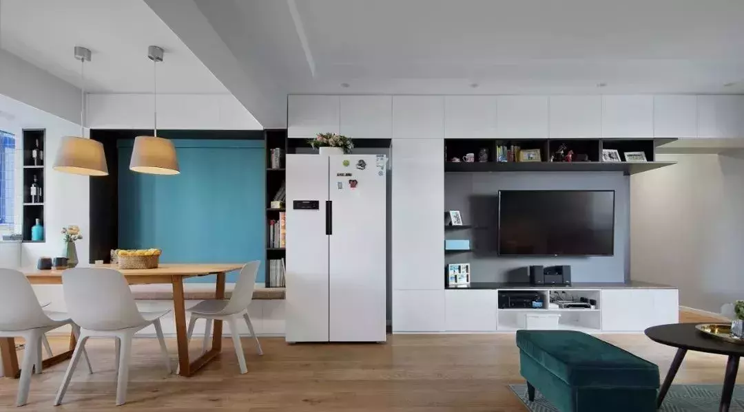 客厅与餐厅相连,打通的设计方式,让整体空间感更大光线更好,冰箱内嵌在电视柜下方,形成一个整体面。