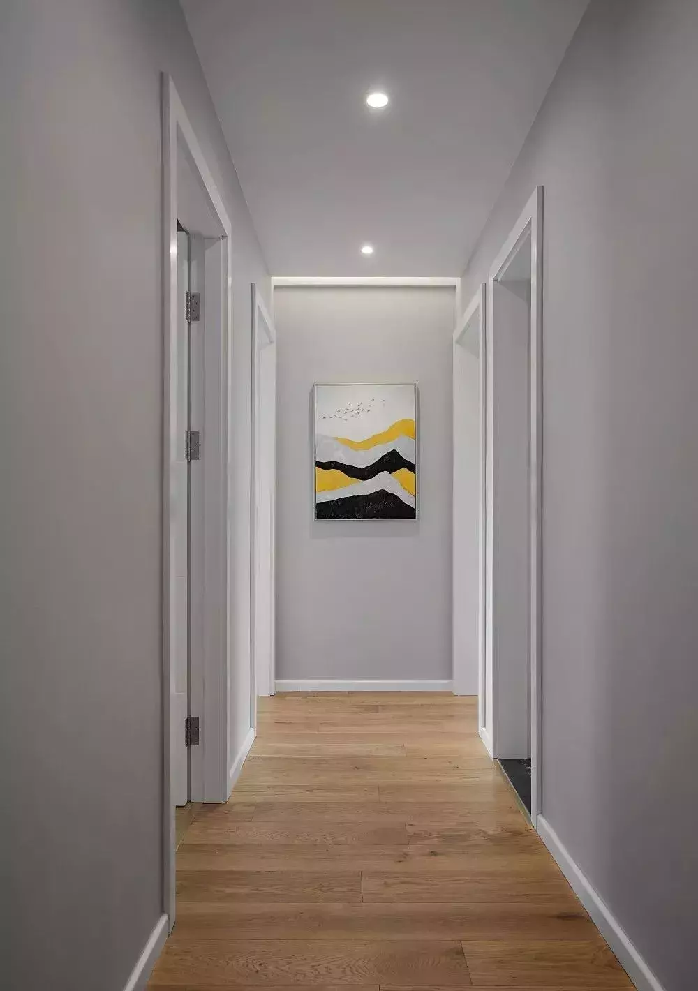 过道墙面采用灰色背景,简洁纯粹,在过道尽头的墙面上挂着一画抽象画,让视觉尽头不会无趣。