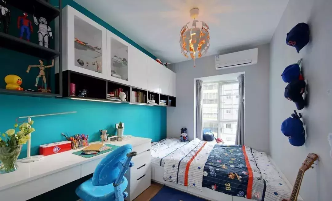 儿童房的色彩搭配更有童真感,儿童房的空间利用非常棒,巧用榻榻米连接书桌和衣柜。