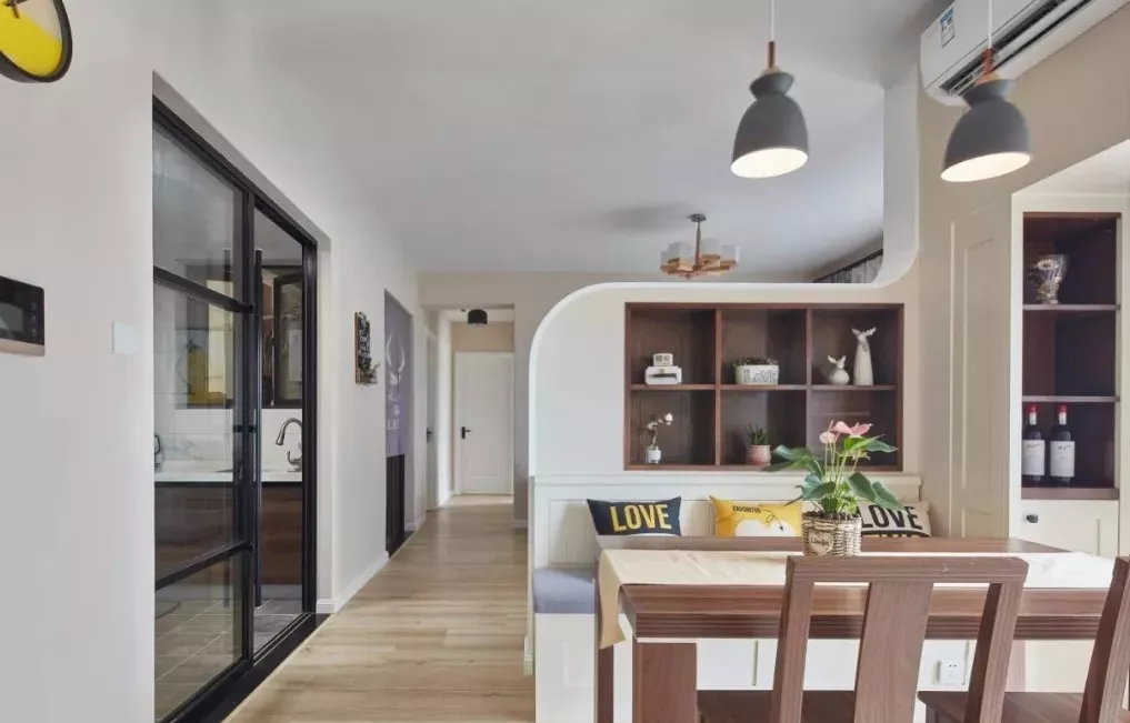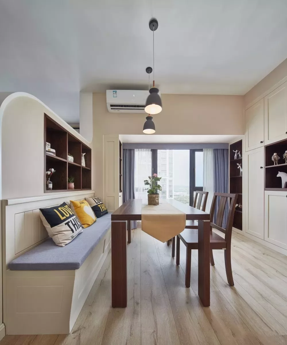 ▲实木餐桌椅搭配卡座设计,节省空间的同时可容纳更多人同时用餐。