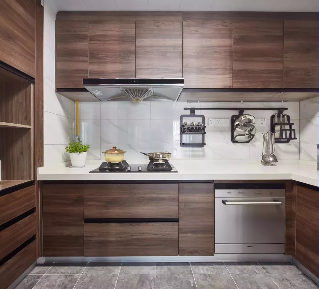 ▲灰色系瓷砖搭配定制款木色橱柜,高端大气有档次!