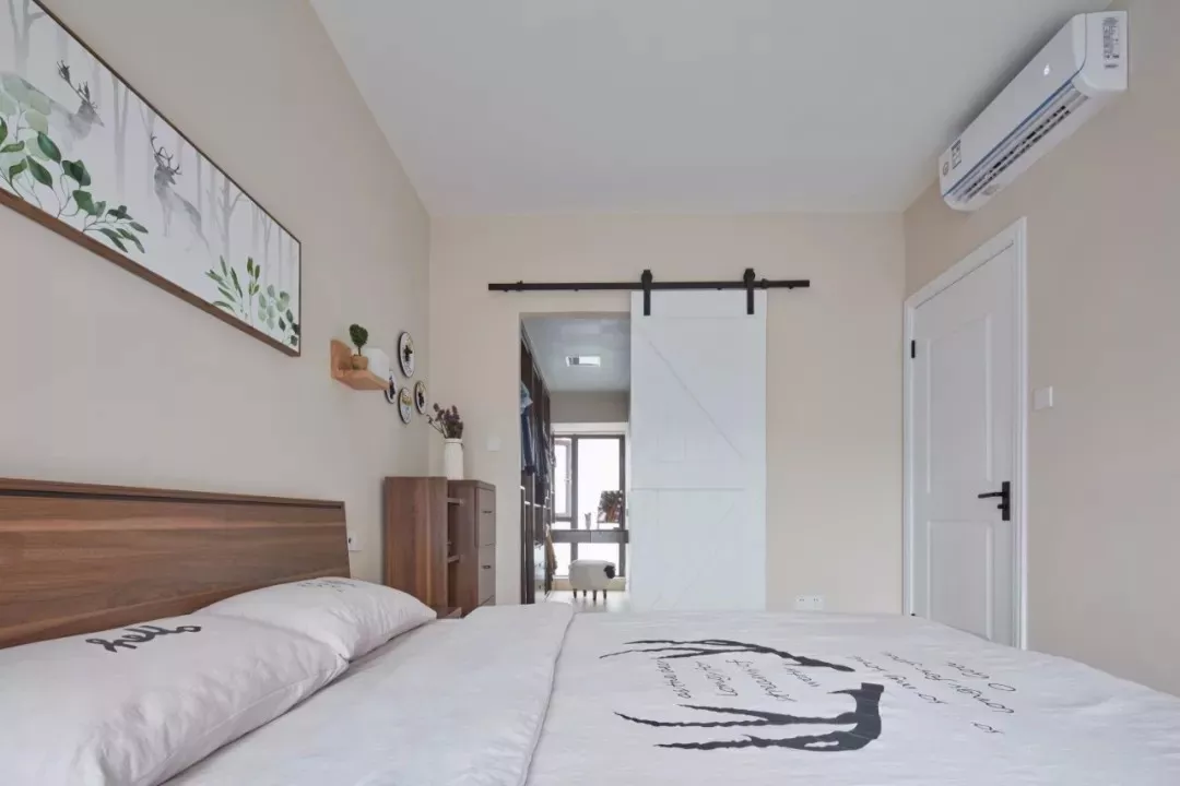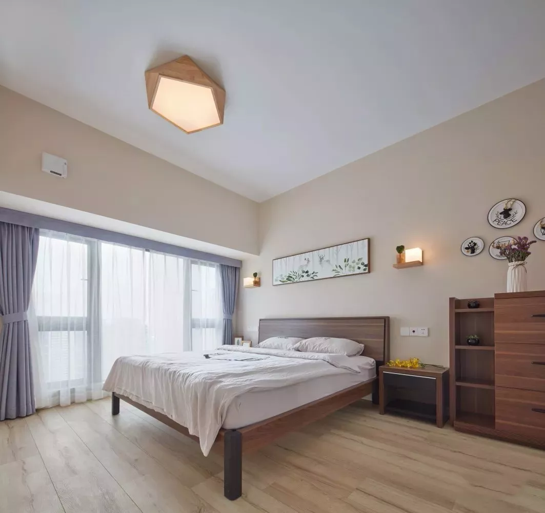 ▲主卧以暖色为主色调,搭配木作家具,打造出一个舒适惬意的休息空间。