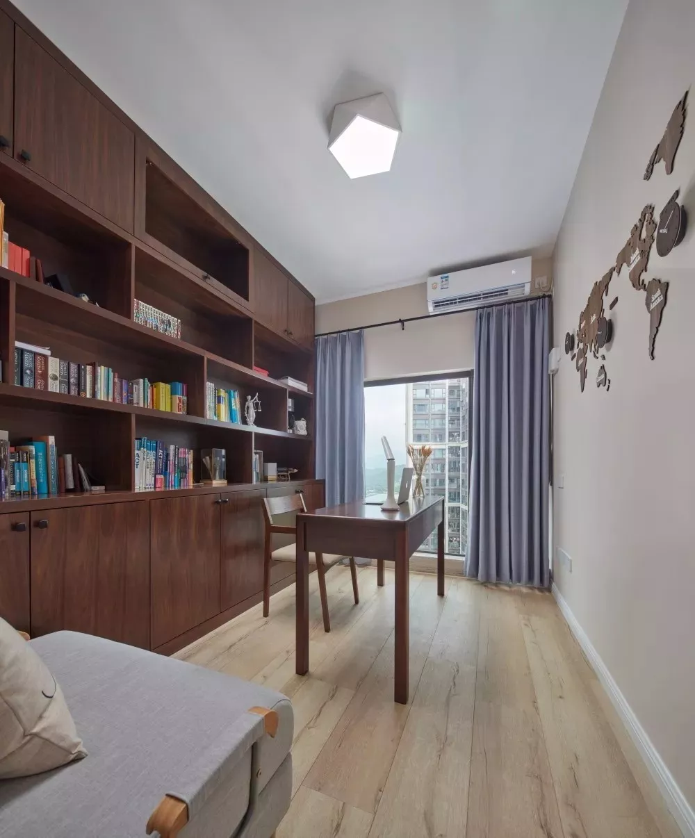 ▲书房里安装整墙半开放式书柜,满足业主放书的需求。