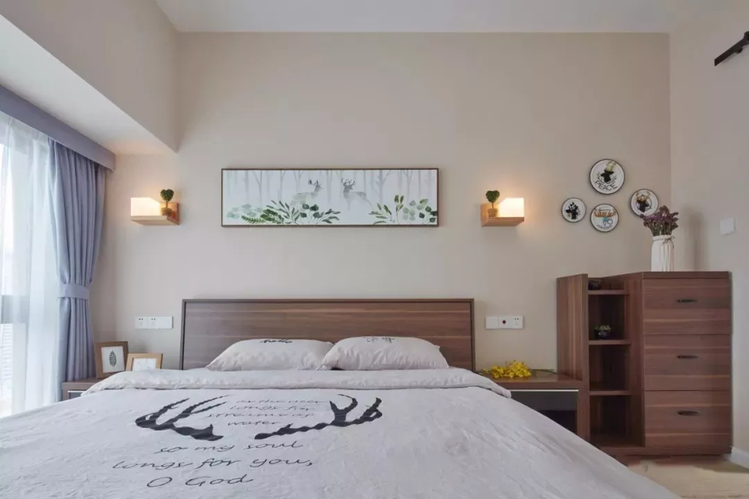 ▲床头背景墙上安装对称壁灯与长条意境装饰画,浪漫感十足。