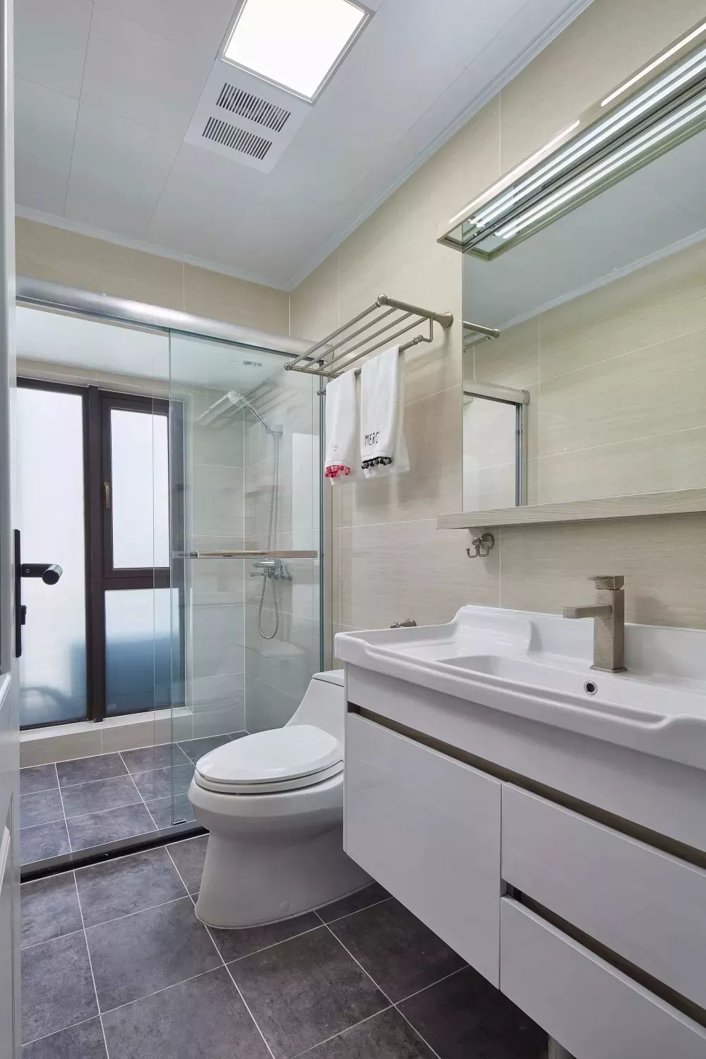 ▲悬空浴室柜搭配墙镜,玻璃推拉门让空间做到干湿分区。