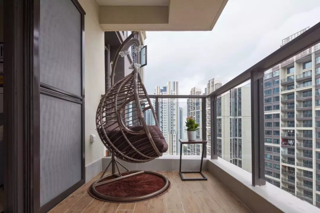 ▲阳光面积宽敞,一架藤制吊椅放角落,吊椅里放柔软坐垫,舒适度满分。