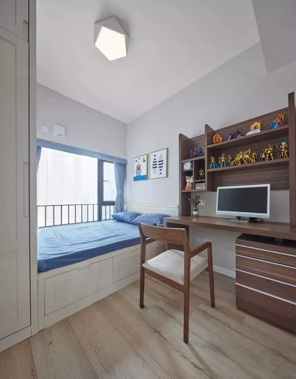 ▲次卧安装榻榻米组合柜,让小空间在兼具储物、工作、休息等功能的同时,不显压抑、狭小。