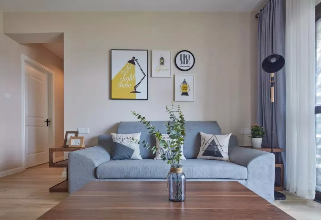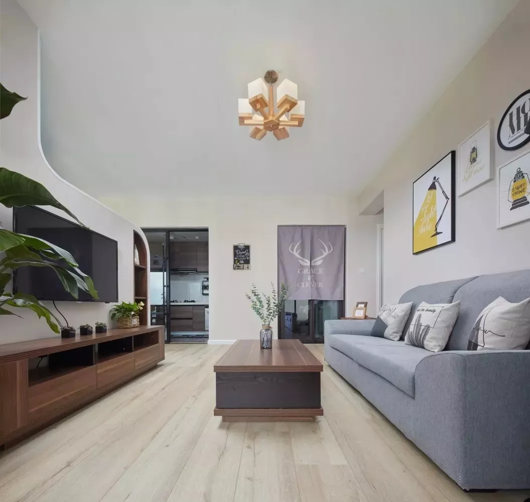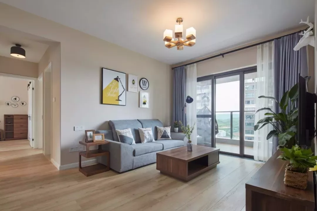 ▲客厅通铺原木地板,搭配暖色乳胶漆墙面、灰紫色窗帘,整个空间温馨舒适。