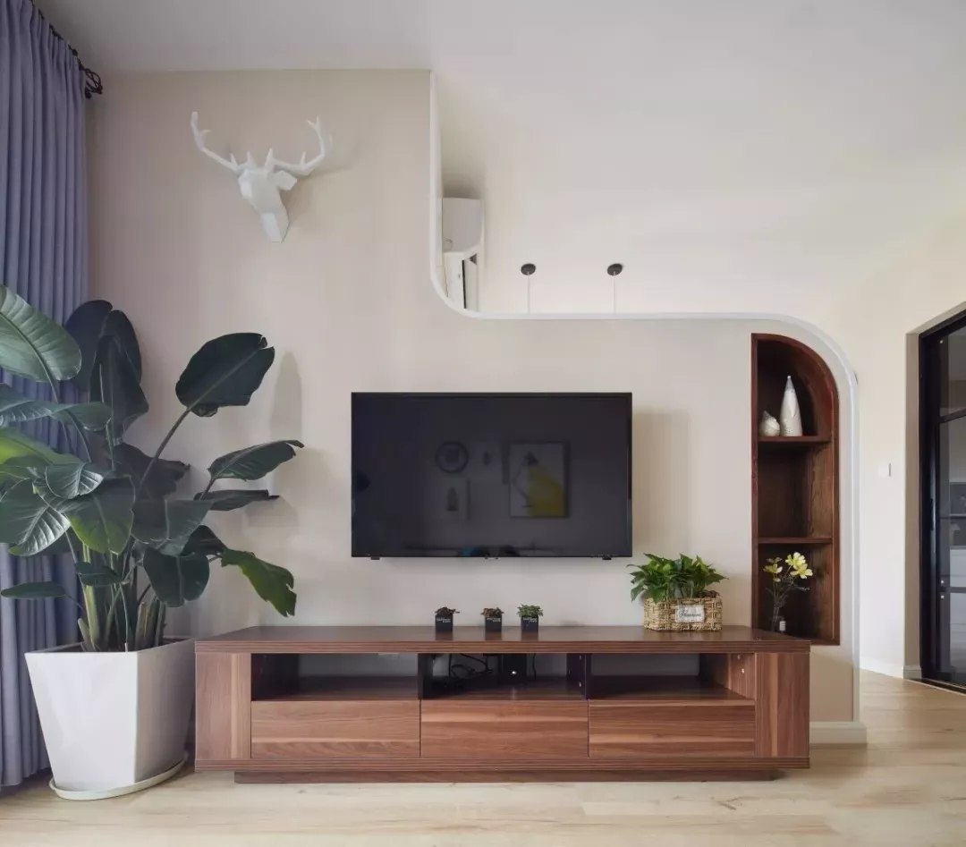 ▲餐厅弧度背景墙也是客厅电视墙背景,鹿头墙饰与大盆绿植给空间增添一份北欧风格调。