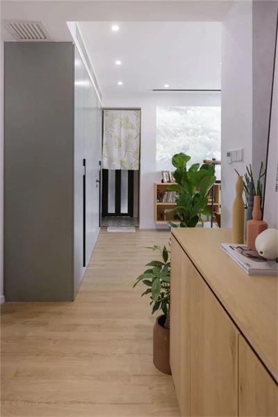入户门旁边设置了玄关柜,这个柜子是成品的,也可以放鞋子,上面做了一些端景的装饰,看起来特别的美观。