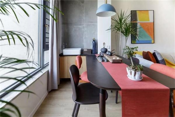 而客厅的阳台被打通后,直接和客厅融为一体,让客厅的空间得到了释放,在阳台的位置做了一个小茶桌。