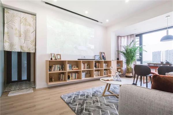 而电视背景墙就是比较亮眼的地方了,底下全部做成了书柜,而上面保留大白墙,装上投影仪,感觉像是在客厅做了一个家庭影院,太喜欢了。