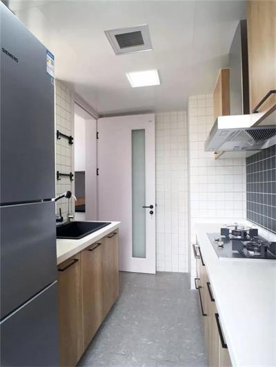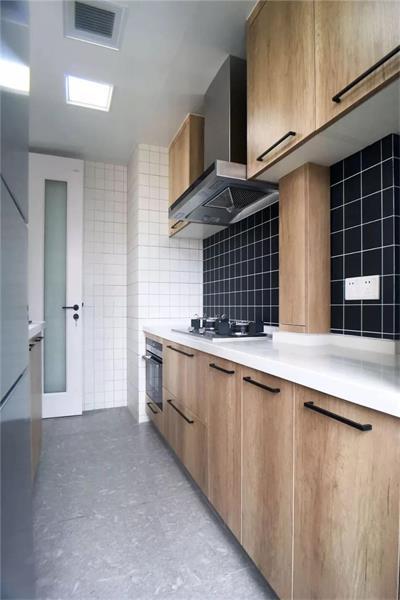厨房是两侧都有门,所以只能沿着过道两侧来规划了,墙面的黑色瓷砖感觉用的比较好,耐脏的同时,也让颜色上面看上去更为鲜明。
