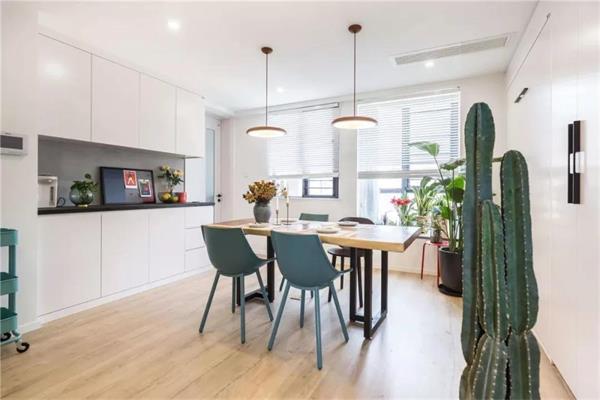 餐厅的旁边利用凹进去的墙面,正好做一排餐边柜,餐边柜的柜门都是按压式的,外面看不到拉手,也保证了柜子的整体性,非常美观。